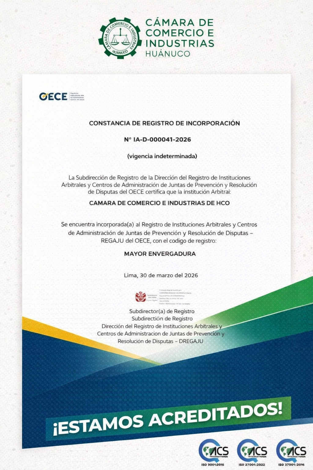 Estamos acreditados con VIGENCIA INDETERMINADA y con código de registro de MAYOR ENVERGADURA en la REGAJU del OECE.