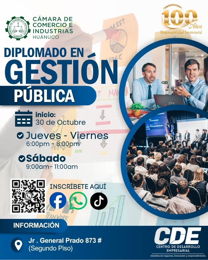 📌 ¡Inscríbete en el Diplomado en Gestión Pública! El Centro de Desarrollo Empresarial de la Cámara de Comercio e Industrias de Huánuco te invita a...