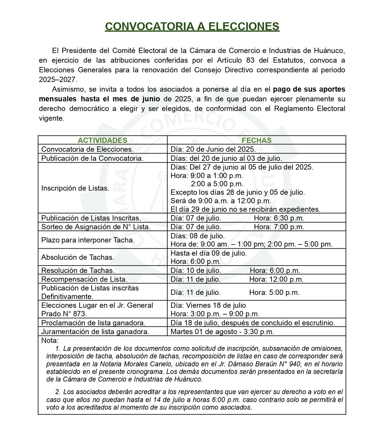 El Comité Electoral de la Cámara de Comercio e Industrias de Huánuco, conformado por: